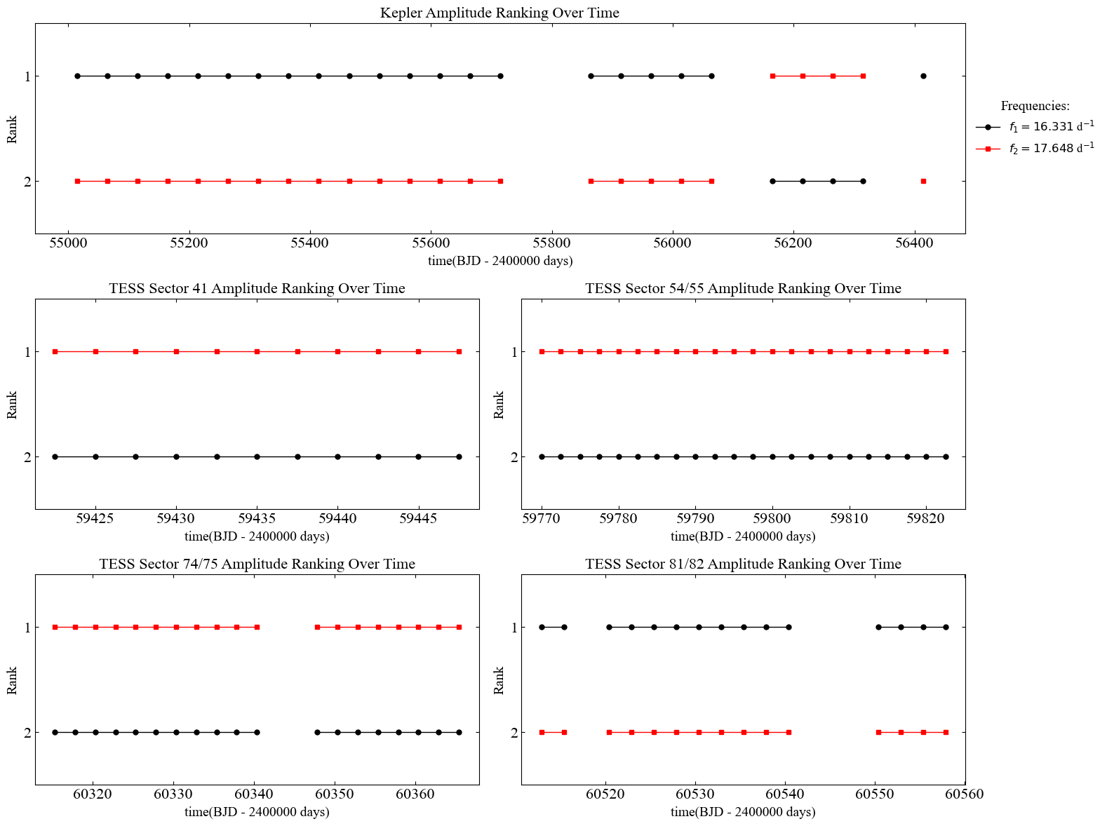 图2: KIC 8712760两个主要脉动模式f1和f2的振幅排序演化。结果显示,f1在Kepler大部分观测时段占主导,而在部分TESS观测时段,f2超过f1成为新的主导频率,表明恒星内部不同脉动模式之间可能存在能量重新分配。