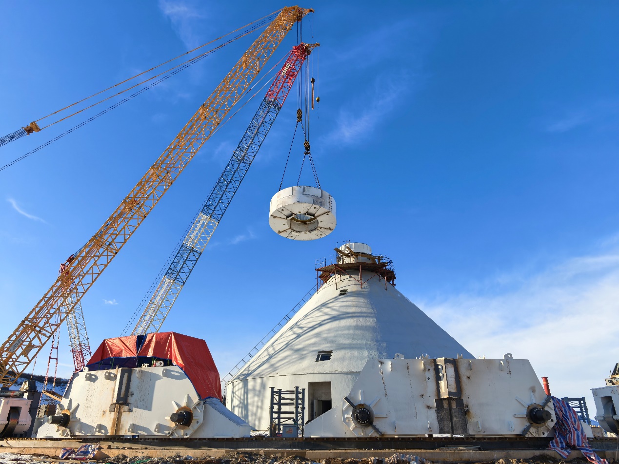 同时,会议高度肯定了项目团队过去一年在保障天线高精度、高质量建设方面付出的努力和取得的成绩:由71段轨道焊接而成的直径76米天线轨道,其表面不平度控制在0.3毫米以内;方位轴承水平度调校至优于10″。这些实验室级别的精度指标,在工程现场通过反复测量与调试逐一实现。时至严冬,为保障工程持续推进,团队制定并严格执行周密的冬季施工方案,落实安全与质量保障措施,确保现场作业安全可靠、质量受控。尽管奇台站气温一度低至-37℃,建设现场依然秩序井然——焊花闪烁,大型构件吊装平稳有序。作为天线座架的中心,重达150吨的中央节点于2025年12月4日顺利完成吊装。该中央节点需由立于轨道之外的两台吊车协同作业,将其从地面抬起,以小于0.3毫米的同轴精度安装于22米高的中央塔基上,吊装半径达45米,主臂仰角50°。历经多次方案论证与细节推敲,团队最终通过单次吊装,圆满实现目标毫米级高精度就位。