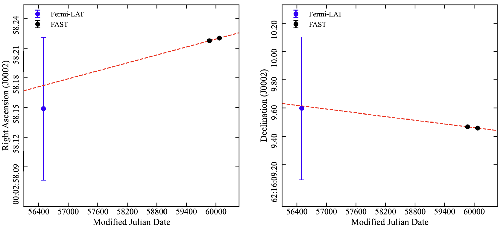 图 1. PSR J0002+6216在赤经和赤纬随时间的变化。蓝点和黑点分别为Fermi和FAST数据,红色虚线为自行的最优拟合结果。