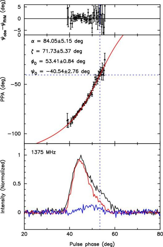 研究人员首次测得该脉冲星的法拉第旋转测量值(RM)为−179.16 rad/m²,并更新了色散量。通过旋转矢量模型(RVM)拟合,确定了脉冲星自转轴在三维空间中的方向,并测得其在天空平面上的投影角约为90度。发现自转轴与自行方向角存在约23度的夹角。这一结果为理解脉冲星的形成过程及其自转与自行运动之间的关系提供了新的观测证据。