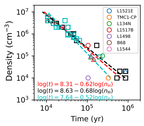 图2:模型拟合观测样本得到的最佳化学年龄与气体密度的关系。黑色、青色和红色虚线分别对应不含、包含PAHs的结果和对前两者整体的拟合。